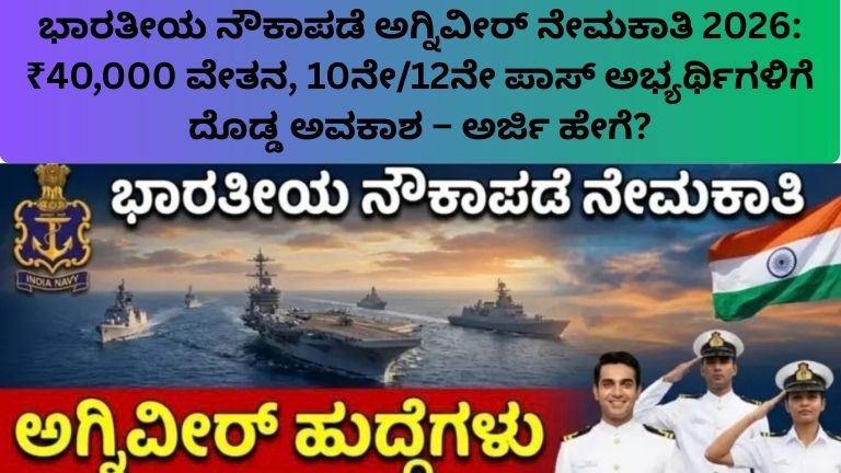 ಭಾರತೀಯ ನೌಕಾಪಡೆಯ ಅಗ್ನಿವೀರ್ ನೇಮಕಾತಿ 2026 ಆರಂಭವಾಗಿದೆ. 10ನೇ ಹಾಗೂ 12ನೇ ಪಾಸ್ ಅಭ್ಯರ್ಥಿಗಳು ಅರ್ಜಿ ಸಲ್ಲಿಸಬಹುದು. ₹14,600 ರಿಂದ ₹40,000 ವರೆಗೆ ವೇತನ. ಅರ್ಜಿ ದಿನಾಂಕ, …